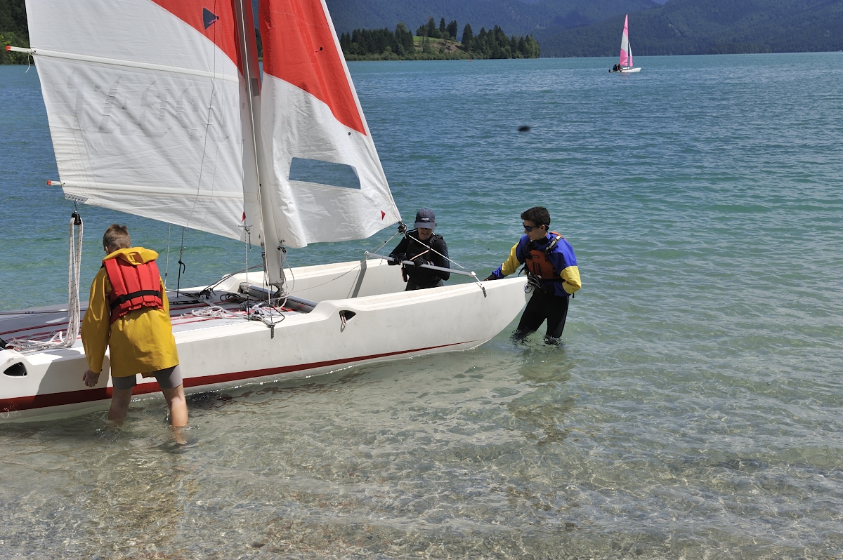 Wie wird ein Sportkatamaran gesegelt? Wer hat auf dem Wasser Vorfahrt? Neben Theorie stand vor allem die Praxis beim diesjährigen Jugendtraining der Segelfreunde Walchensee e. V. am 16. Juli auf dem Clubgelände in Einsiedl im Vordergrund. Der Segelverein hatte interessierte Jugendliche aus der Region zu der Veranstaltung am Walchensee eingeladen. Schon nach kurzer Einführung und gemeinsamen Bootsaufbau, ging es für die 14- bis 18-Jährigen aufs Wasser. Rasch bekamen die zwölf jungen Segler ein Gespür für ihre Katamarane und steuerten, abhängig von der Windrichtung, die Boote über den See. Neben den Clubbooten stellten Vereinsmitglieder ihre Sportkatamarane für das Jugendtraining zur Verfügung. Am Ende des Trainings wurde gemeinsam gegrillt. “Mit dem für die Jugendlichen kostenlosen Training, möchten wir junge Leute für den Segelsport begeistern”, erklärt Ulrich Begemann, Vorsitzender der Segelfreunde Walchensee e. V. und freut sich über die rege Teilnahme. “Unser Verein bietet Jugendlichen günstige Rahmenbedingungen für die Ausübung des Segelsports, zum Beispiel die Nutzung der Vereinsboote.”
